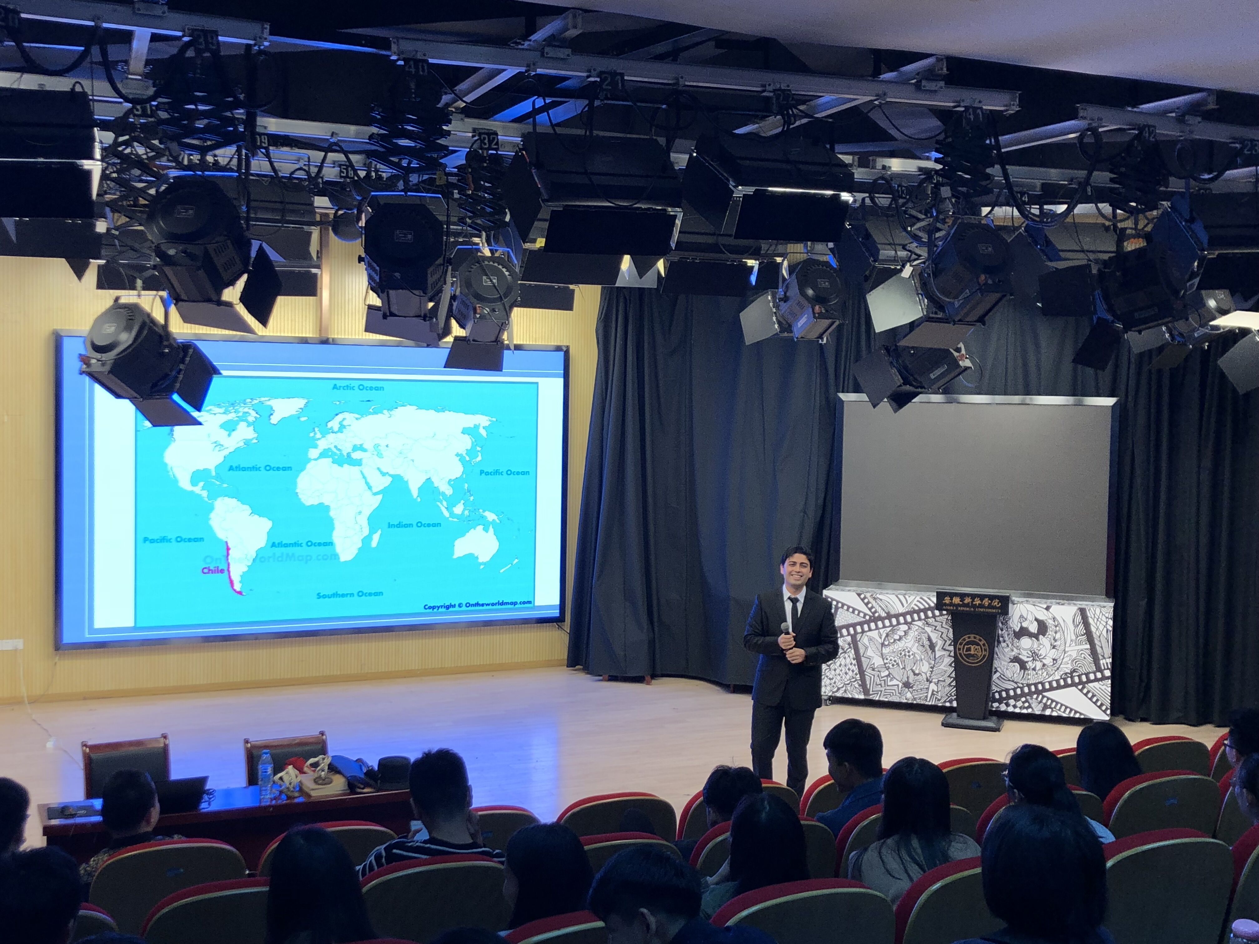 本网讯(通讯员:周倩)10月31日下午,国际教育学院国际文化讲座在新闻演播厅如期开展,本次讲座的主题为“The beautiful landscape and legends of Chile”。