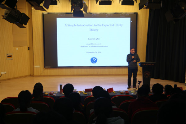 最后,邱国新作主题为“效用期望理论简介”的讲座。邱国新凭着自己从教24年积累的教学经验和学术知识,为现场师生们分享了关于效用期望理论的知识和案例。