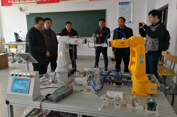 在安徽工程大学机械与汽车工程学院,院长许德章陪同调研组参观了机器人拆装、机器人控制等实验室,现场展示了工业机器人的运行轨迹控制、生产调度和多机协互等。并以其机器人工程专业办学为例,针对人才培养方案、实验课程体系、实验教学模式、实验室配套资源、学科竞赛开展等情况作了详细介绍。双方还就实验教学开展、双能型师培养等方面进行了深入交流。