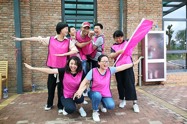 到达拓展场地,体验了农家大锅灶后,团队开展了“破冰起航”活动。小组成员在规定时间内拟定队名及口号,完成队徽的绘制。随后各组依次进行了队歌的表演和团队造型的展示,活跃全场气氛。