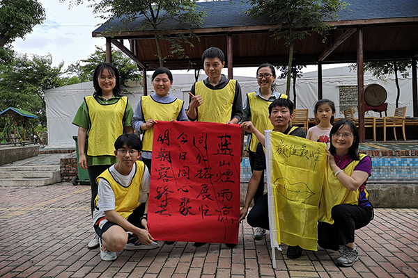 “神笔马良”项目中,各小组进行了诗词的即兴创作,并通过细绳固定的毛笔合力书写。“蓝山烟雨凉,同仁拓展忙。今日同心聚,明朝露锋芒”既体现了学院的专业特点,又展现了教职工团结一心,共创辉煌的雄心壮志。