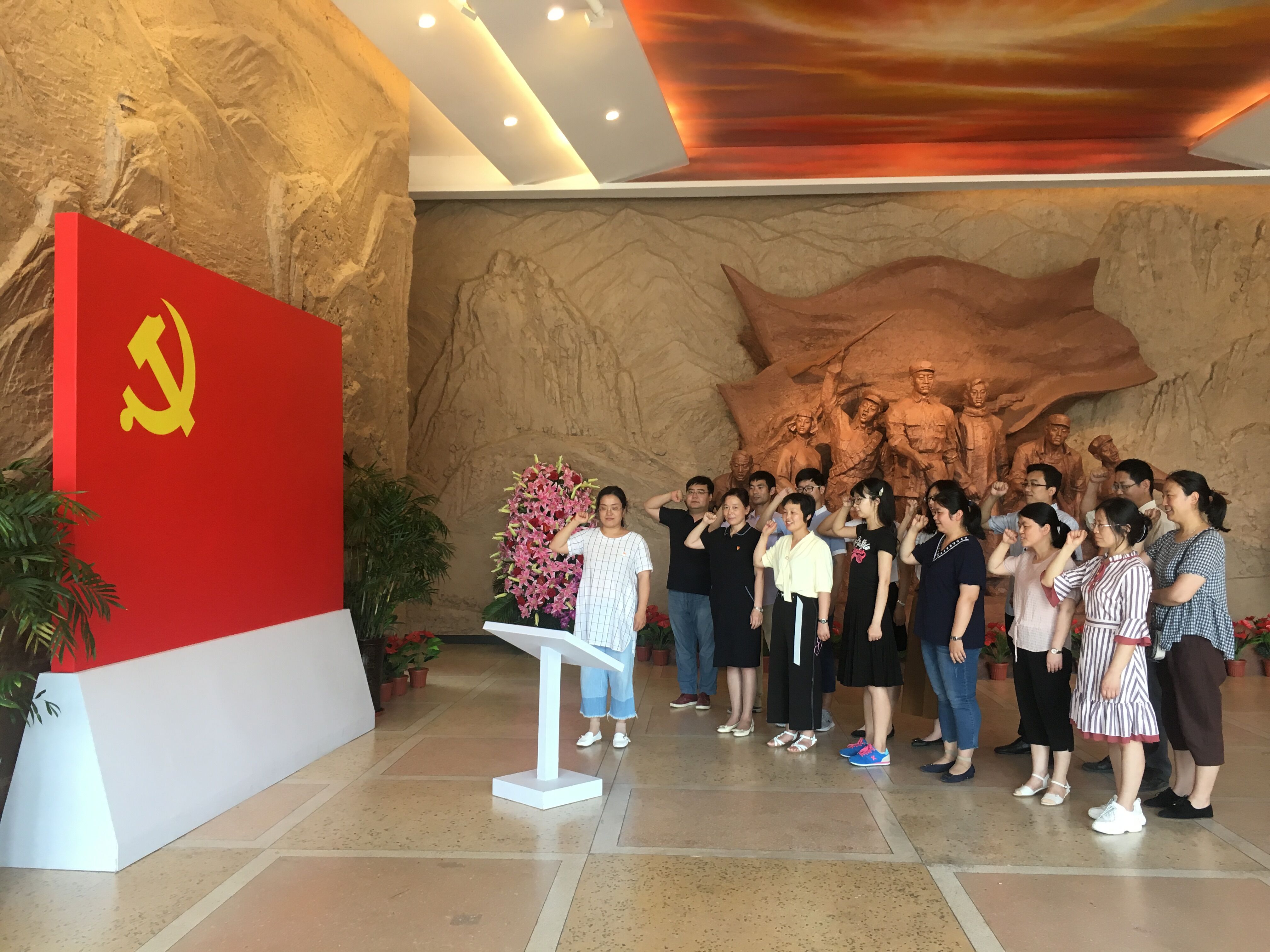 全体党员教师怀着十分崇敬的心情,缅怀革命先烈,重温峥嵘历史,接受红色洗礼。面对鲜红的党旗,静默肃立,在支部书记董丽娟的带领下,全体党员庄严举起右手,重温入党誓词。