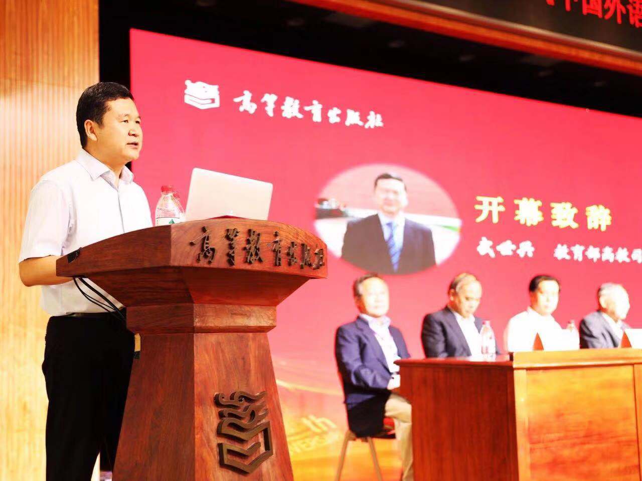 9月20日上午, 教育部高教司人文社科处处长武世兴为论坛致开幕辞。武世兴处长在致辞中点明了当今外语教育的形式和任务,强调要进一步深化外语教学改革,推进新闻科建设。他指出,重视高层次外语人才的培养有助于“走出去和“讲好中国故事,在专业课程中合理融入明确的中国特色价值观有助于加快构建中国特色话语体系。