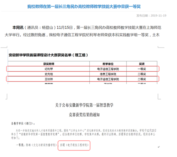 本网讯(通讯员:李文谨)2019年,电子通信工程学院教师在一系列省校级教学比赛中喜报频传。第一届长三角民办高校教师教学技能大赛纪利琴荣获一等奖;安徽省第二届移动教学大赛苏巧平老师荣获二等奖;第三届中国高等学校电工学青年教师“RIGOL杯”讲课竞赛申小芳、王琰琳老师荣获安徽赛区一等奖;bat365在线中国官网登录入口首届课程设计大赛纪利琴、王琰琳老师分别获得理工组一、二等奖;bat365在线中国官网登录入口首届“智慧课堂”比赛彭霞老师荣获一等奖等。