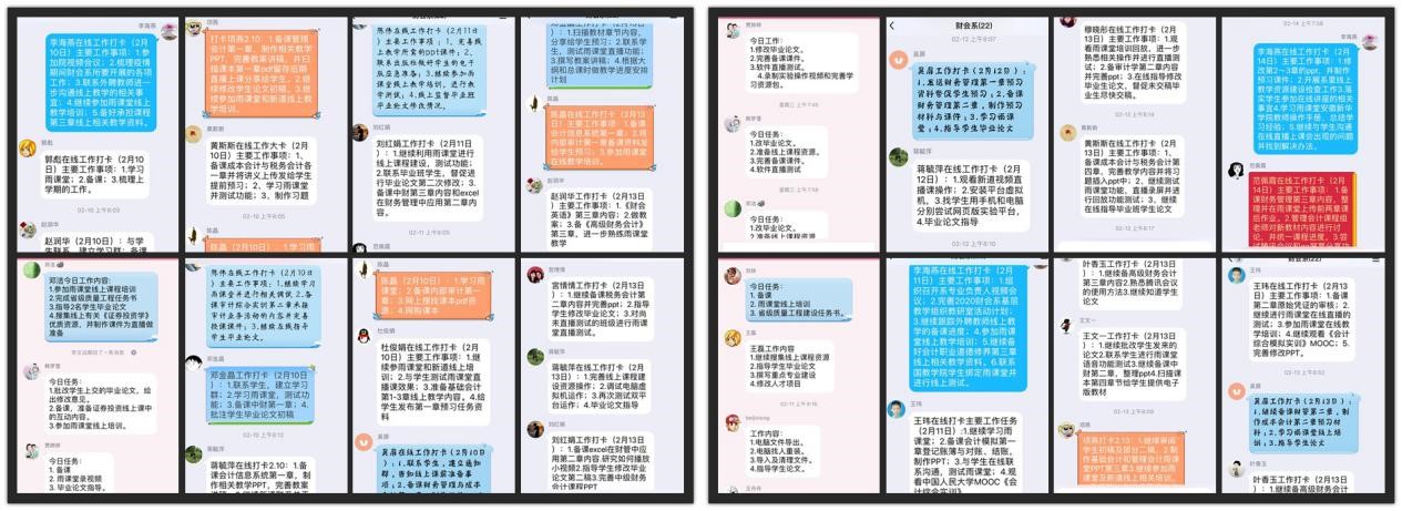 财会与金融学院为了保障线上教学工作的正常运行,落实“停课不停教,停课不停学”的指导要求,教学工作组制定了《财会与金融学院2019-2020学年第二学期全面实施课程线上教学工作方案》,召开四次线上教学准备工作视频会,制定了涵盖七个“全覆盖”的线上教学保障措施,带领每个任课教师建设线上教学资源,确保每门线上教学课程符合开课要求,学院为老师们提供了国家精品课程资源网上地址,老师们研读课程教材、录制微课、学习雨课堂线上教学平台操作,坚持每日线上办公,进行任务打卡。