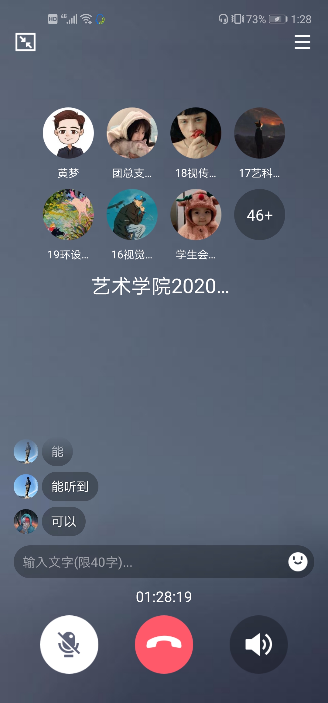 本网讯(通讯员:黄梦)为及时了解疫情期间学生新学期思想动态,准确掌握、正确研判学生思想政治工作情况,维护线上教学活动的稳定开展,根据校团委工作指示,艺术学院于2月28日中午召开了2020年春季新学期学生思想动态线上座谈会,艺术学院院长助理郑妮、刘刚、行政兼学管秘书黄梦、辅导员代表高扬、张小菊及各班级团支部代表、各学生组织主要负责学生参加会议,会议由黄梦主持。