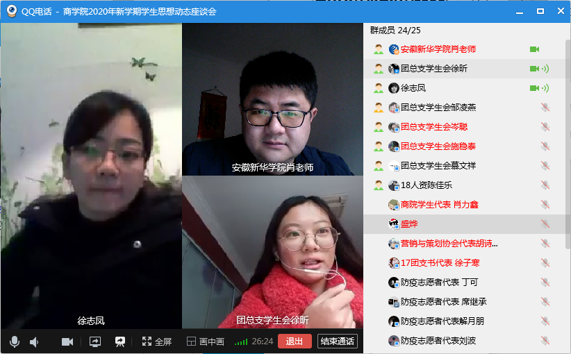 本网讯(通讯员:肖华君) 为进一步了解新冠肺炎疫情期间学生思想状况,维护好线上教学,引导大学生积极、健康成长。2月29日下午,商学院通过QQ群召开了2020年春季新学期学生思想动态线上座谈会。商学院行政副院长徐志凤、学管秘书肖华君以及各年级各社团学生代表参加了本次会议,会议由肖华君主持。