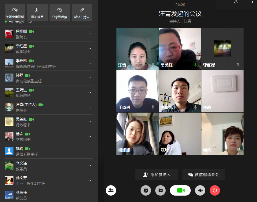 会上,汪青首先对电子通信工程学院第一周线上课程教学质量监控情况包括课前检查、随堂听课、课后学生调查等方面进行了反馈,整体教学运行平稳有序。随后,与会人员就专业评估、学士学位评审,一流专业、一流课程遴选培育、本科毕业论文(设计)工作以及专升本准备等工作进行了研讨。