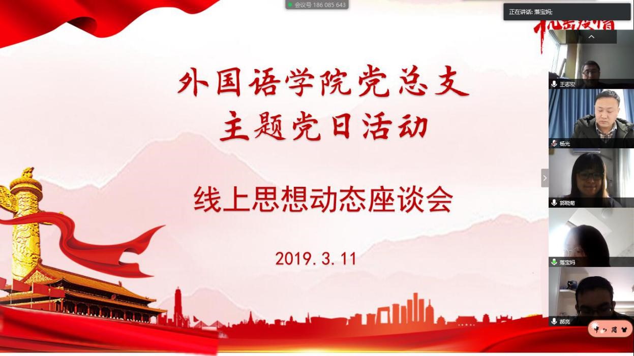 本网讯(通讯员:郭晓菊)当前,新冠病毒防控形势依然严峻,为切实做好疫情防控的各项工作,充分发挥党组织的堡垒作用和党员的先锋模范作用,3月11日,外国语党总支全体委员一起开展了线上思想动态座谈会。党总支副书记杨光、纪检委员王志宏、组织委员郝亮、宣传委员郭晓菊、青年委员陈丽,以及组织员汪凌汇参加,座谈会由汪凌汇主持。各位参会人员轮流发言,汇报疫情期间各自的思想动态。