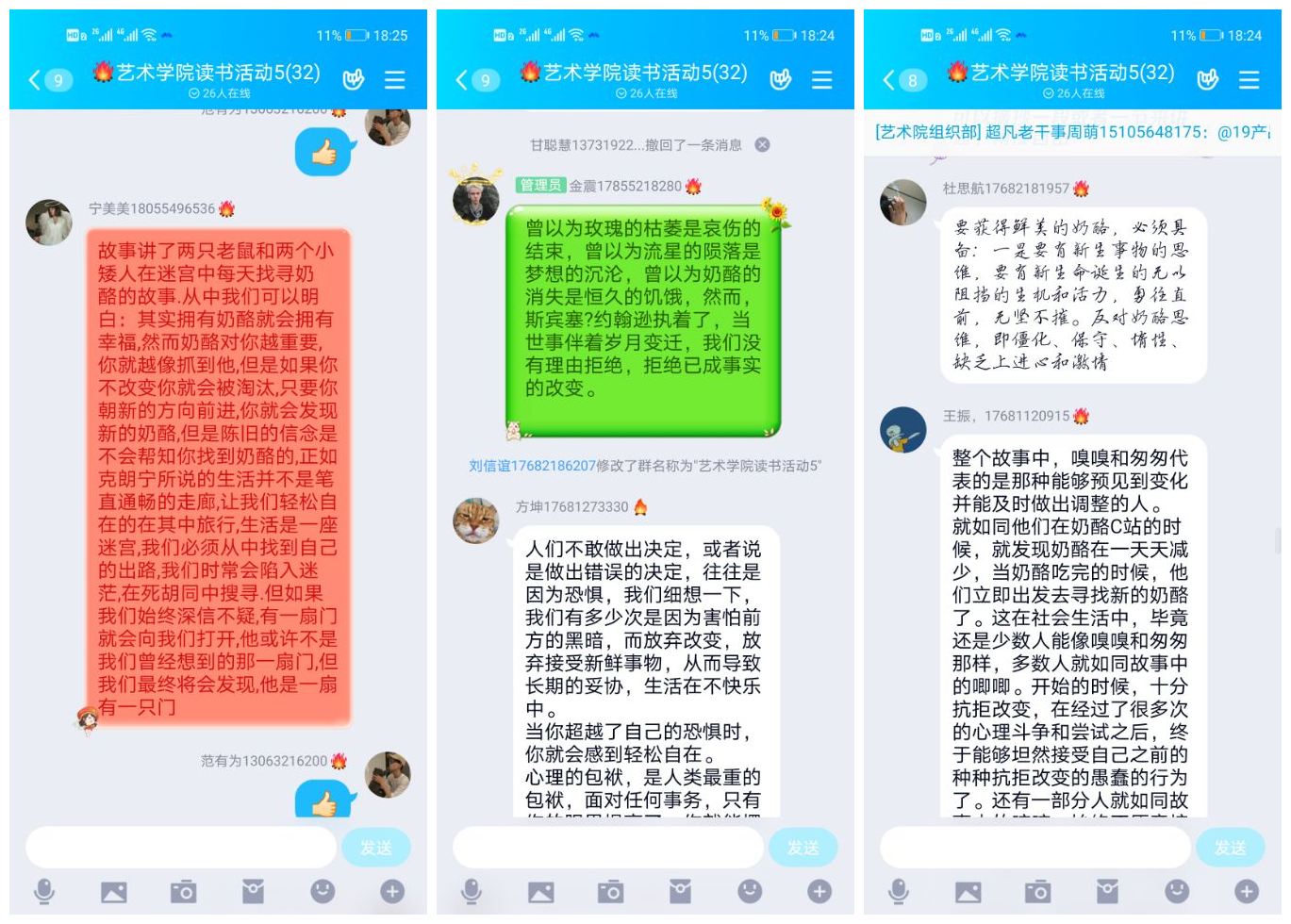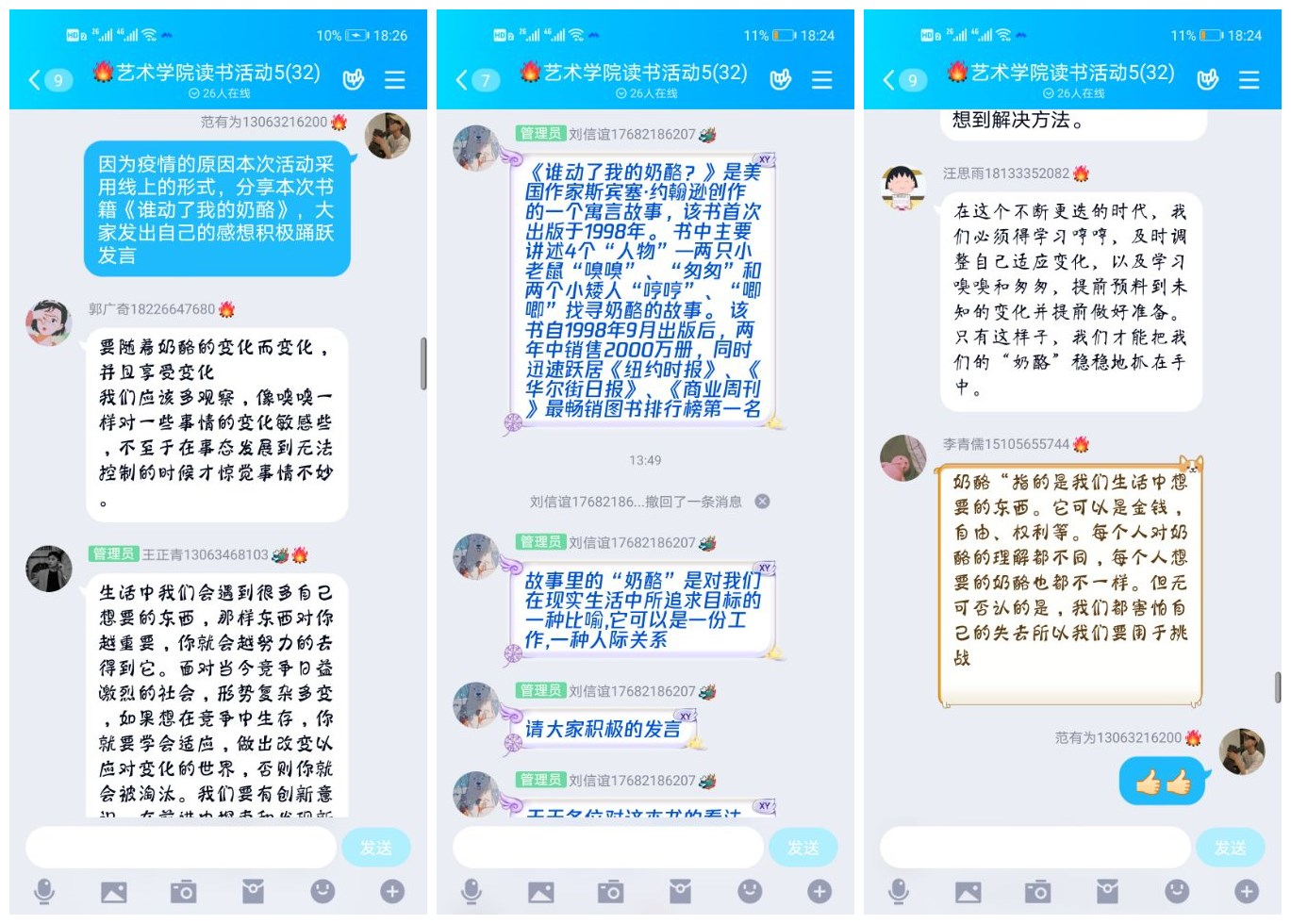 艺术学院2019级视觉传达设计1班举行了线上读书活动。活动开始由主持人范有为同学发言,介绍了本次活动的流程,包括读书分享、互动游戏等环节。随后班级成员依次分享阅读《谁动了我的奶酪》后的感受,主人公老鼠嗅嗅,老鼠匆匆,小矮人唧唧能时刻注意着微小的变化,未雨绸缪,迅速掌握当前情况,快速分析出最佳做法,及时地调整自己去适应变化是我们学习的榜样。接着,班级同学通过游戏的形式将活动推向高潮,在互动过程中打开知识的海洋,开阔视野,也丰富了阅读量,提升了同学们的精神境界。最后,由主持人范有为同学和班长刘信谊同学进行总结发言, 无论生活中遇到什么样的困境,都要学会抛弃负能量,保持积极乐观的态度来对待生活,尤其在疫情当前,更是如此。