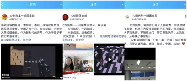 在举国上下万众一心、众志成城,新冠肺炎疫情防控形势持续向好、生产生活秩序加快恢复的关键时期,增强防控意识,掌握预防措施更显尤为重要。同学们通过自己的朋友圈、QQ、微博等途径,积极了解官方媒体发布的各类疫情信息、健康防护知识。通过拍摄视频参与活动,承诺疫情防控从我做起,为“打好防疫战”贡献一份青春力量。
