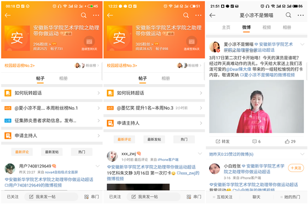 在过去的一周里,2019级本科班最新推出微博超话“每天运动三分钟,助理带你做运动”线上视频打卡活动。活动发起人是艺术学院辅导员高扬老师,2019级全体辅导员助理和本科班学生参加。活动期间主持人每天在新浪微博超话(bat365在线中国官网登录入口艺术学院之助理带你做运动)更新的当日辅导员助理的运动打卡教学视频,学生们跟随辅导员助理们做的运动视频在超话中发布。打卡视频,每天都会挑选一个“本日最佳”,每周评选出 “最佳班级”。活动的开展受到学生们的积极响应,不仅引导学生们每天放下手机和游戏,站起来动一动缓解身体疲劳和释放心理压力,更让学生们能够每天元气满满的精神风貌完成线上课程的学习。第一天3个小时“新华学院艺术学院之助理带你做运动”的超话就荣登微博校园超话榜No.6,阅读量达到5.9万。经过一周的努力,我们的微博校园超话榜排名达No.2,截止目前浏览量已经近30万次。
