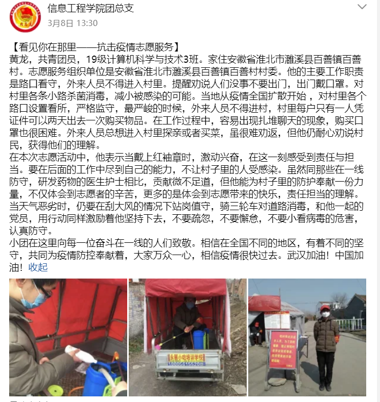 活动开展以来,信息工程学院百余名学子自愿报名参加各类志愿者活动,冲在防疫阻击战的一线,积极助力疫情防控,用实际行动服务身边广大群众,切实发挥党员及共青团员的模范作用,为打赢疫情防控阻击战注入了温暖力量。