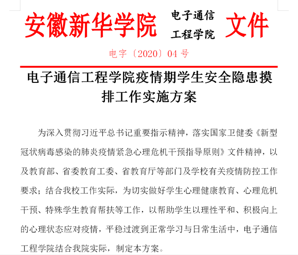 本网讯(通讯员:杨宏) 新型冠状病毒感染的肺炎疫情防控形势严峻复杂。为贯彻落实习近平总书记关于坚决打赢疫情防控阻击战的重要讲话和指示批示精神,落实省委、省政府和教育部部署,根据省委教育工委、省教育厅关于做好新型冠状病毒感染的肺炎疫情防控期间线上开学通知精神,电子通信工程学院按照学校指示,依据《安徽省高等学校新型冠状病毒感染的肺炎疫情防控期间线上开学工作指南》和《bat365在线中国官网登录入口新冠肺炎疫情防控期间线上开学工作方案》,特对疫情防控期间全体师生持续进行安全隐患排查。