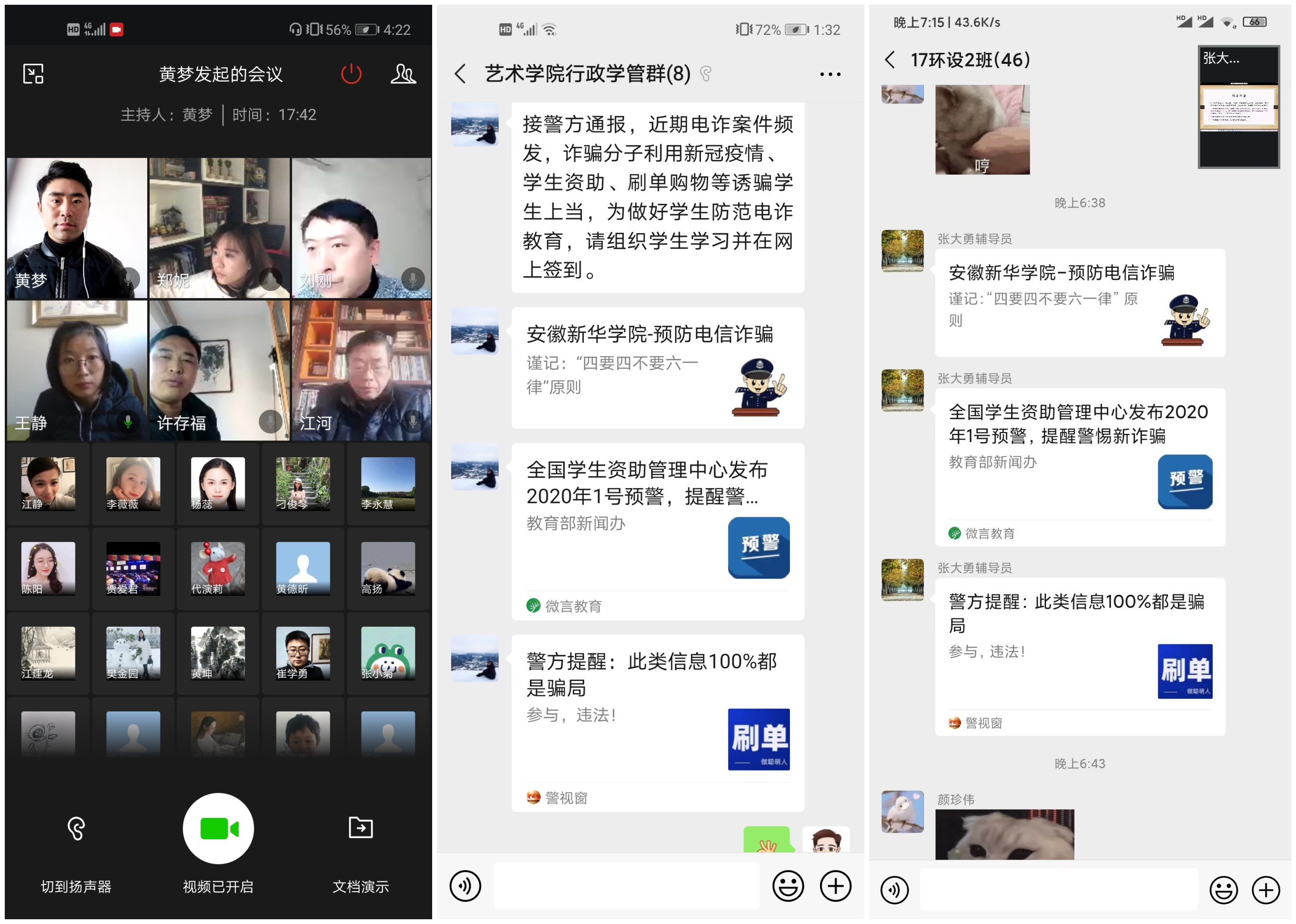 特殊时期,也是电诈案件频发时期,为保护广大师生及学生的个人财产不受侵害,艺术学院组织了“防范电诈教育”专题学习,要求全体师生注意防范诈骗分子利用新冠疫情、学生资助、网络刷单、网络购物、网络兼职的诱骗,组织全体学生进行专题学习并线上签到。