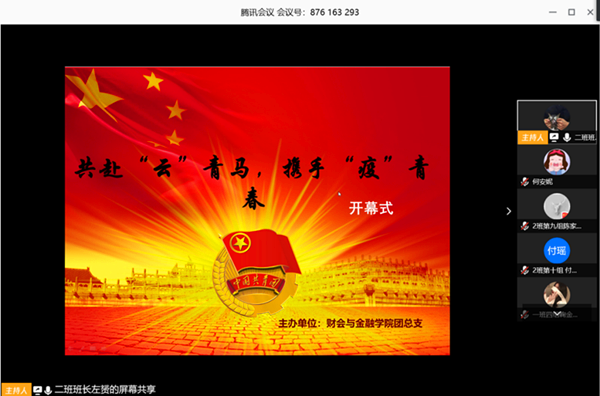 本网讯(通讯员:何倍)疫情防控特殊时期,为提升当代大学生思想政治觉悟及政策理论意识,提高学生干部工作能力水平,充分发挥“互联网+教育”作用,4月8日,财会与金融学院于线上举办“共赴‘云’青马,携手‘疫’青春”第三期青马工程培训班开班典礼。财会与金融学院党总支副书记芮萍、团总支书记、第三期青马工程培训班的各位学员以及部分学生干部代表参加本次典礼。