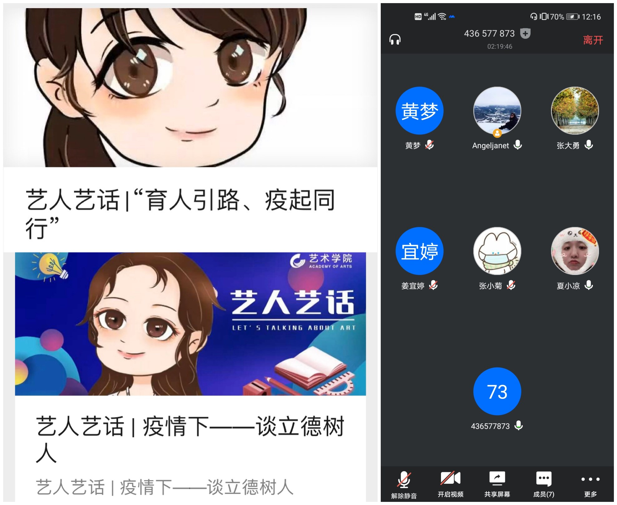 艺术学院自2019年4月在学院微信公众号中创立了“艺人艺话”专栏,该专栏以学院学工团队为主要创作力量,专栏以理论宣讲、实践指导、工作所悟等方面的原创文章形式呈现,每周一期,通过“文字的力量”凝聚青年、引导青年、服务青年。各位老师通过对比自己现在和一年前文字的差距成长,对比自己和他人文章的风格差异(以本期的理论宣讲为主题),分析自己的优势和劣势,从横向和纵向两个层面的剖析自身写作特点,明确自己今后进步的方向和空间。随后,辅导员们展开自由研讨,研讨内容聚焦在“如何提升个人理论素养”和“如何将理论知识与实践工作完美结合”上。艺术学院院长助理郑妮针对参会老师提出的问题进行了一一解答,她强调,作为学工人员要明确自身职业定位和职业要求,明确政治立场,增强自身理论学习水平,不仅要学习理论知识,更要将理论知识内化、吸收,这样才能在日常的工作中善用理论指导实践工作,积极发挥新时期高校辅导员育人功能。