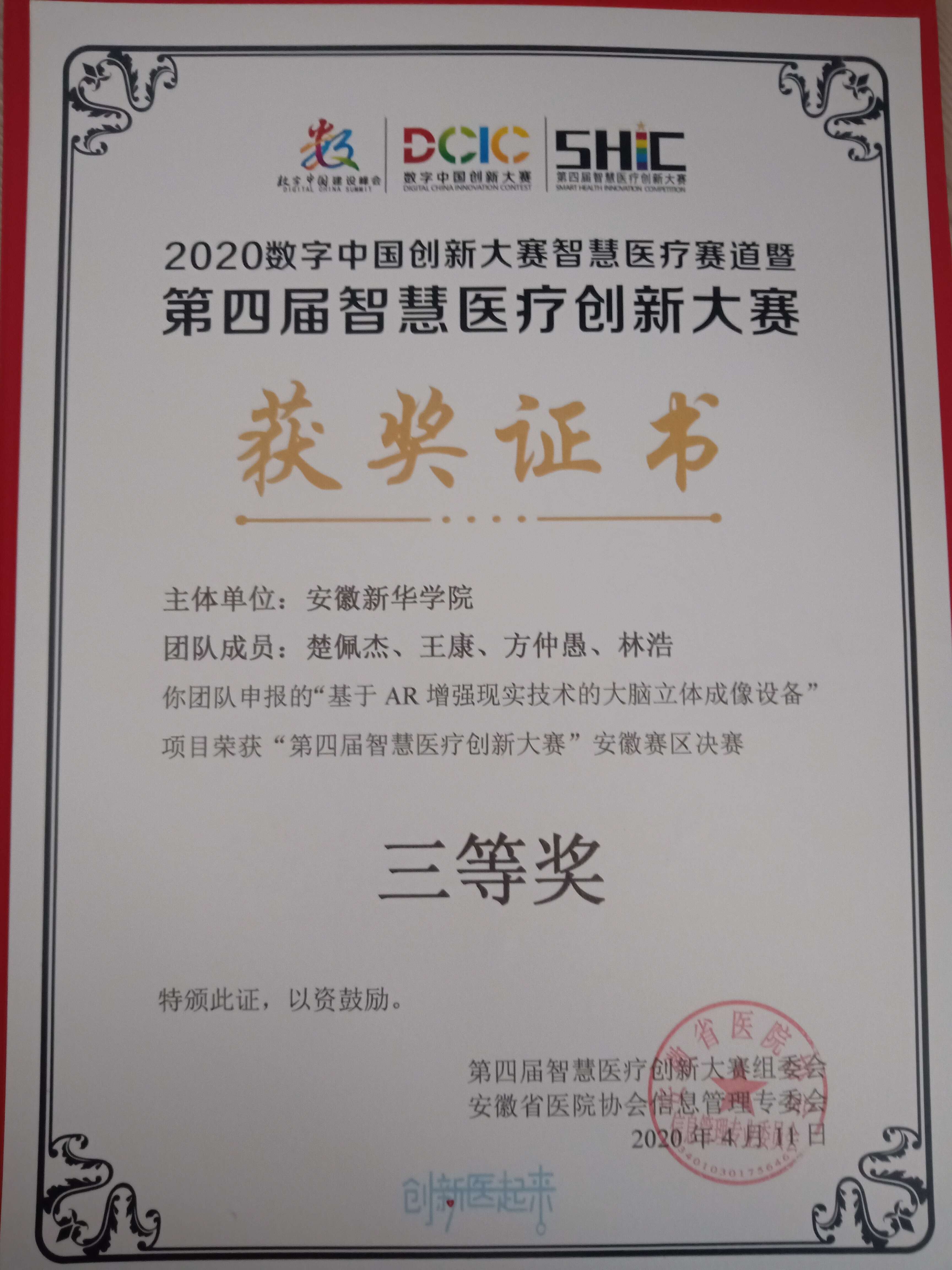 本网讯(通讯员:苏丽)近日,2020数字中国创新大赛智慧医疗赛道暨第四届智慧医疗创新大赛举行。bat365信息工程学院苏丽老师指导的楚佩杰、王康、方仲愚、林浩同学“基于AR增强现实技术的大脑立体成像设备”项目获得安徽赛区决赛三等奖。