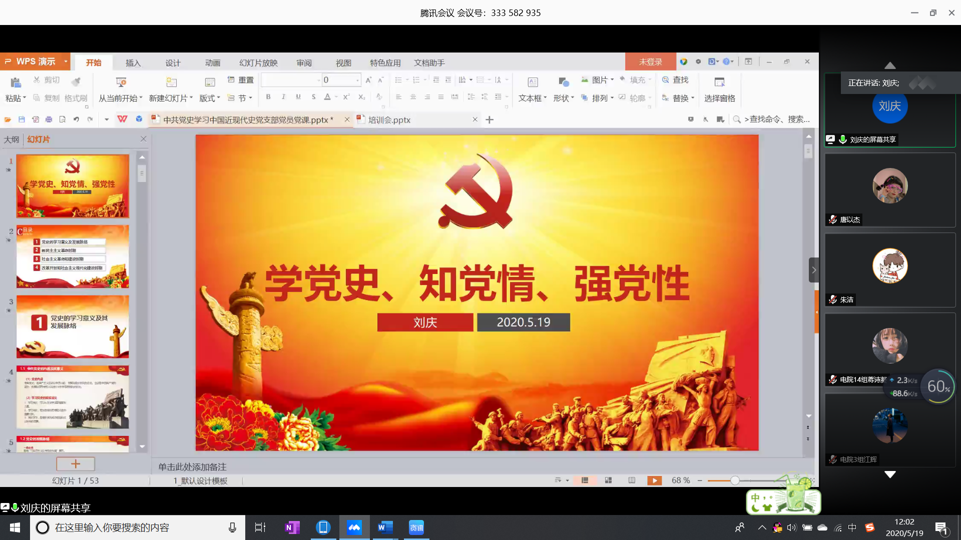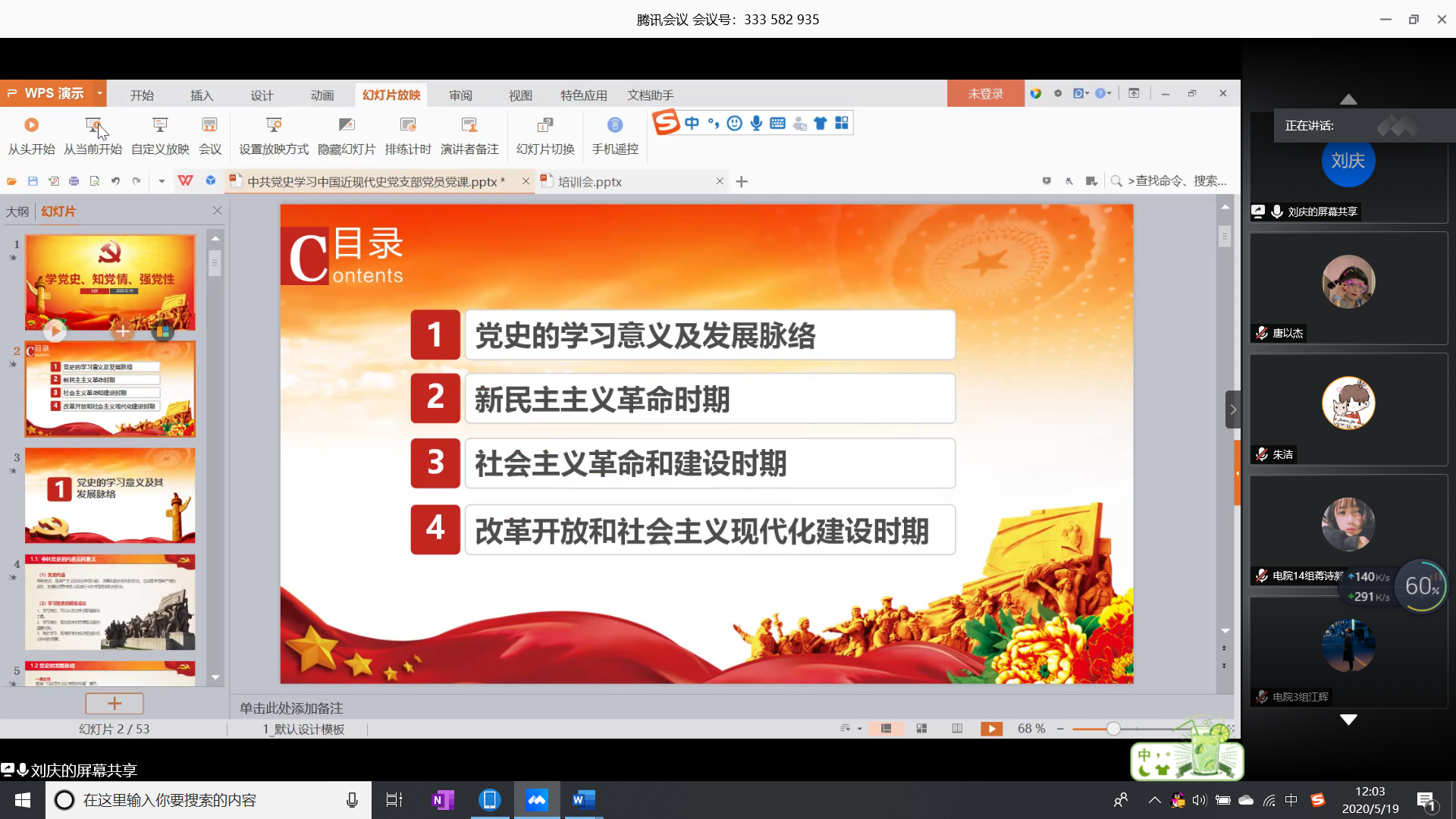 本网讯(通讯员:唐以杰)外国语学院分党校联合电子通信工程学院和国际教育学院于5月19日召开以“学习党的发展史”为主题的线上理论学习课。全体入党积极分子参加本次理论课程,课程由外国语学院第二支部书记刘庆主讲。