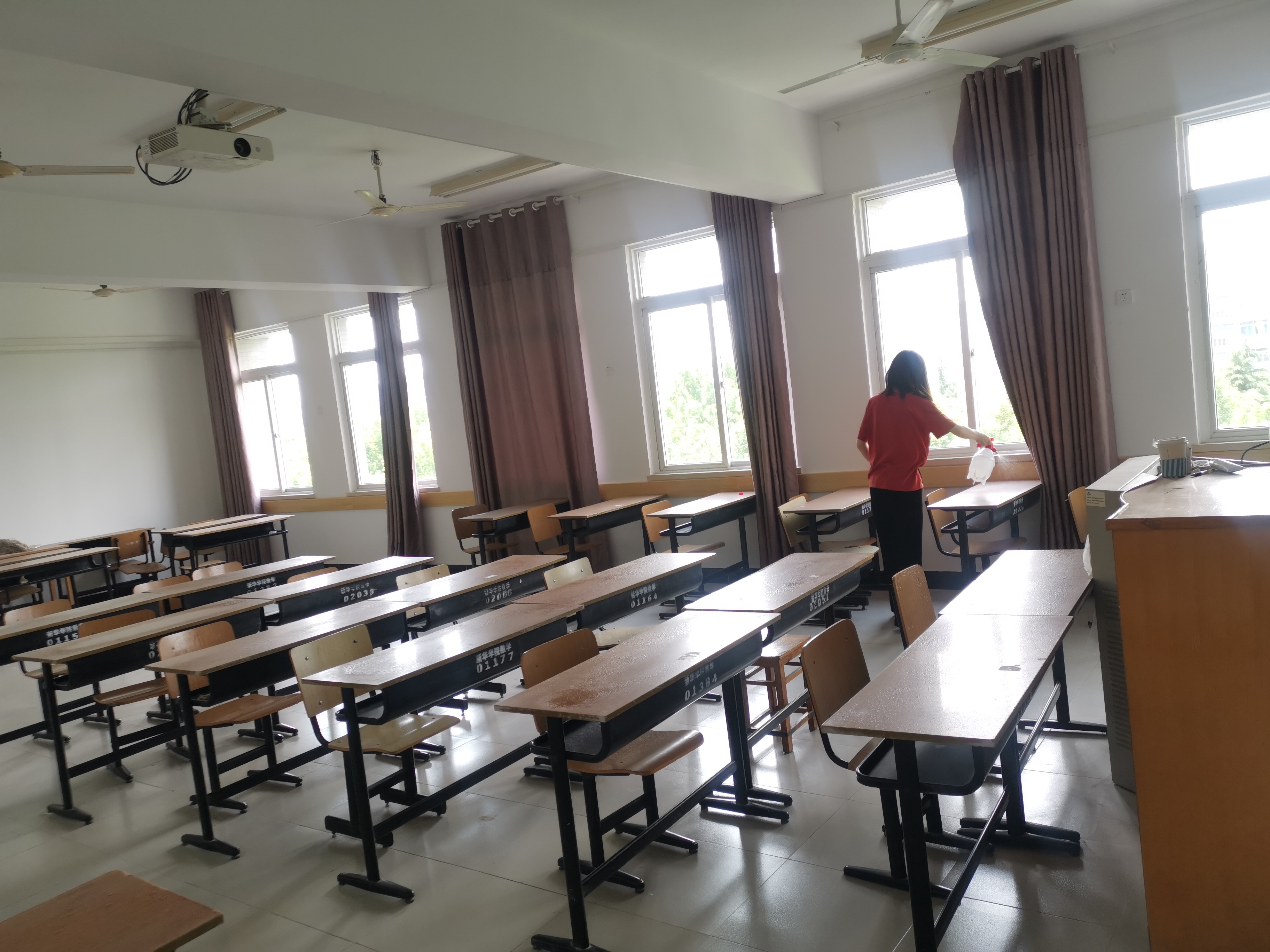为了给返校的学生建立一个良好的学习环境,外国语学院全体党员教师还开展了教室消杀工作,为学生返校保驾护航,教师以2人为一组,在做好个人防护的基础上,携带学院配备的84消毒液等工具,前往外院各个教室,进行卫生清扫和消杀工作。面对疫情,当天也是论文答辩的时间,人手不够,没有工作任务的教师主动加入到防控工作中来,带头参与志愿服务,用坚定的信心和责任感、使命感,为打赢疫情防控这场没有硝烟的战争贡献出自己的一份力量。