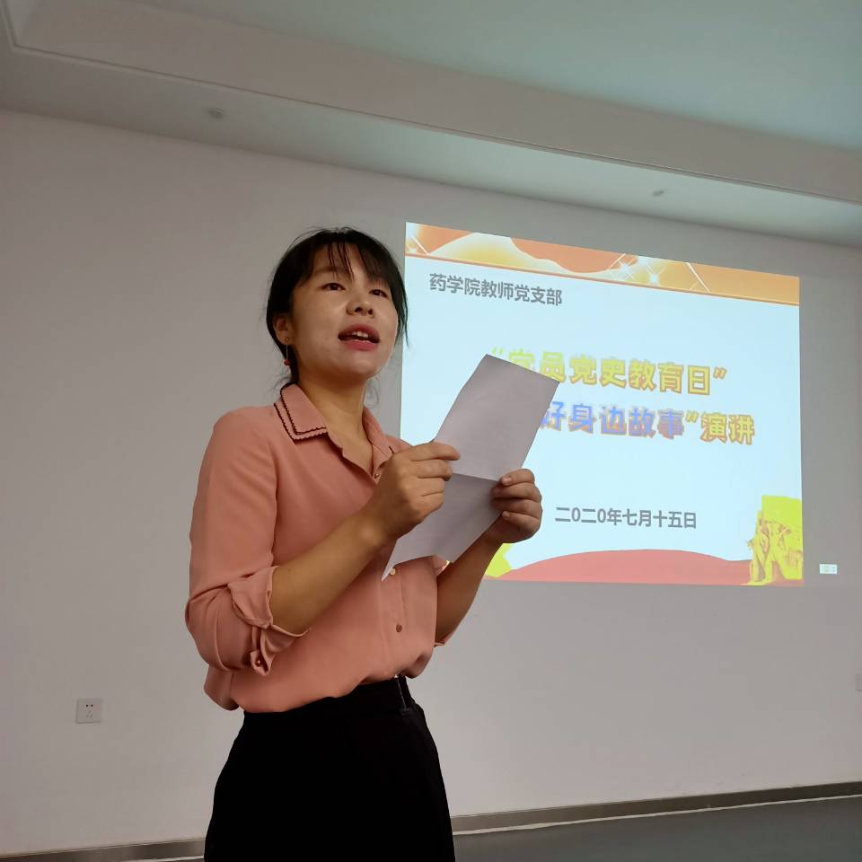 根据上级党委及学校党委的通知,药学院开展“党员党史教育日”之讲好身边故事演讲活动,目的为教育引导党员教师坚定理想信念,进一步激励党员教师新时代新担当新作为强化党员意识,真正起到模范带头作用,不忘初心牢记使命,全心全意为人民服务。