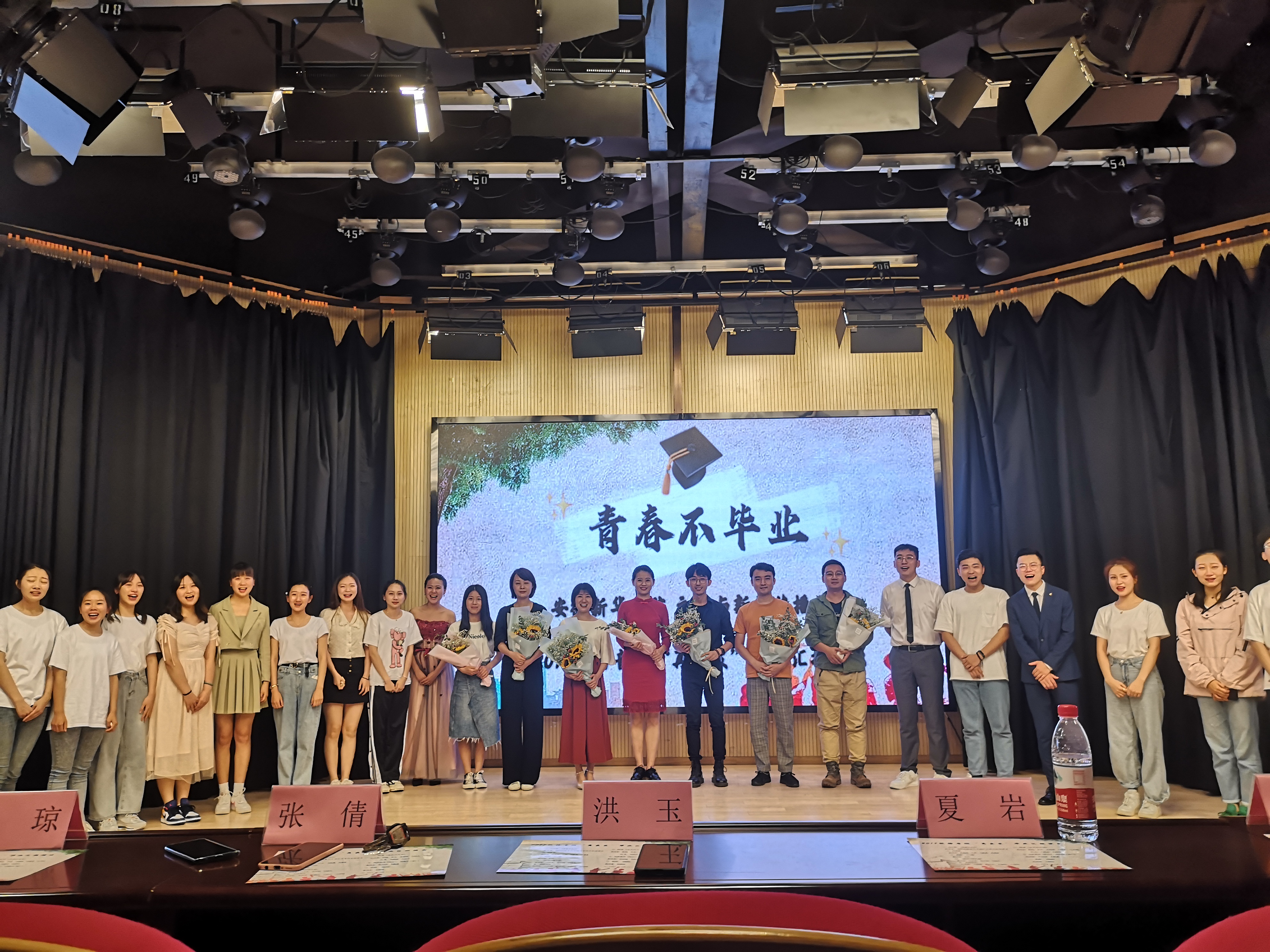 在最后阶段,本次汇演的指导教师夏岩上台为2017级播音班的同学们播放了专属毕业MV《我们》。MV记录了2017级播音班在大学生活中的点点滴滴,配合着感人的音乐,一幅幅画面闪过,让在场的所有人为之动容。