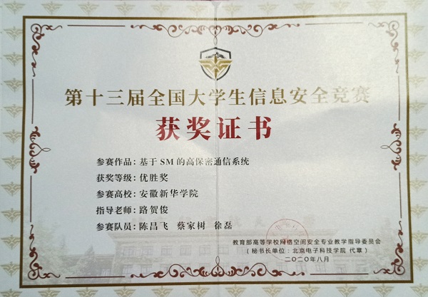 针对本次赛事信息工程学院领导高度重视,精心组织,经过校赛选拔,由陈昌飞、蔡家树、徐磊三名同学组成的“安全通信护卫队”战队代表bat365参赛,并安排路贺俊老师担任专业指导教师,克服疫情带来的不利影响,学生不在校、不集中,暑期积极备战,在线上无数次的开会讨论,电话、视频远程指导、加班加点,几经修改打磨,经过师生的共同努力,所提交的作品“基于SM的高保密通讯系统”,顺利通过初赛,并在决赛中获得“优胜奖”。