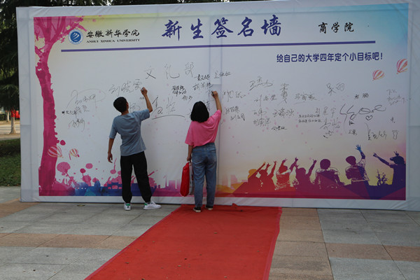 “给自己的大学四年定个小目标吧!”在商学院东门广场竖起的签名墙已是字迹满满,签名墙上记录着商学院新生们对大学四年的憧憬与对自己的期望。新生在签名墙前合影留念,为自己的大学生活拉开帷幕,开启新篇章。“我要在大学努力好好考研,为了考研开始从大一做准备,勤奋学习,追求自己的电商考研梦。”电子商务专业的费同学自信满满地立下自己的大学四年规划。