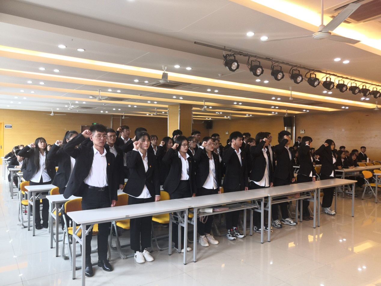 随后学生代表戴明宇同志发言。他从大学生的视角带领大家思考了如何做一名合格的党员。他号召广大学生党员积极行动起来,用自己的行动努力在全院营造良好的学习氛围,做文明的传播者,做制度的守护者。倡导每位学生党员严格要求自己,不断提升自己、完善自我。接着,在戴明宇同志的带领下,党员代表们举起右手,握拳过肩,高声宣读入党誓词。