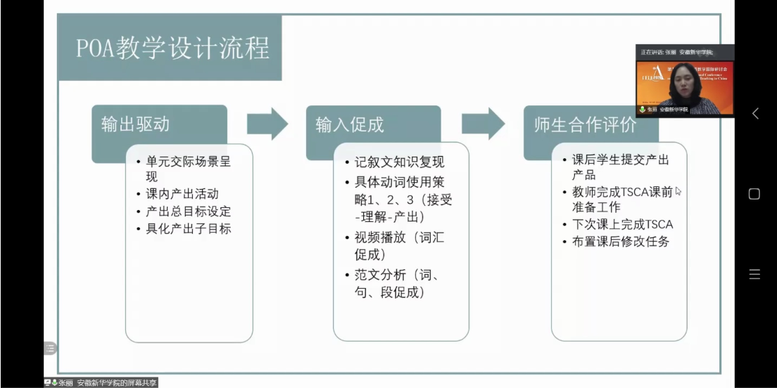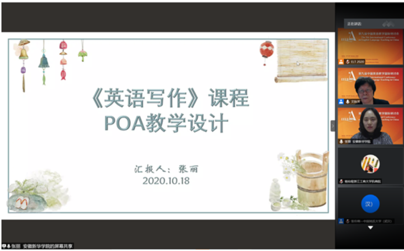 本网讯(通讯员:张丽)10月18日上午,外国语学院教师张丽通过“产出导向法-专业学习虚拟共同体(POA-PLC)”推荐,参加第九届中国英语教学国际研讨会,作为POA-PLC教师代表在 “‘产出导向法’(POA)在大学外语教学中的应用专题论坛”进行POA教学设计汇报。专题论坛采用腾讯会议和腾讯直播进行,在线同时参会、观看直播人数达到1900人次。POA虚拟教师发展共同体建设者文秋芳教授主持会议并作重要发言;POA核心团队成员点评汇报人的教学设计。
