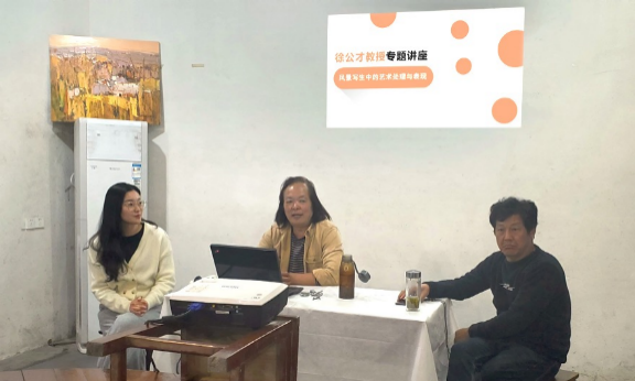 徐公才紧紧围绕 “风景写生中的艺术处理与表现” 主题进行分享,以自身艺术经历为开场,从传统风景绘画的要点与不足、景色的取舍、画面色彩关系的处理、写生及创作等四个方面同学们做了理论与实践相结合的阐述。讲座既为同学们介绍了色彩写生过程的相关知识,又指出了同学们在色彩写生过程中出现的一些问题与误区,并结合自己的艺术创作经历与同学们分享了色彩写生的经验。