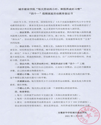本网讯(通讯员:郑晖)为确保学生安全到家、切实推动学生劳动习惯养成,城市建设学院在给家长发放的“2021年寒假致家长的一封信中”首次加入了增强学生劳动教育理念,并配有内容详细的“四个一”假期家庭劳动教育倡议书,积极建立家校互动,倡导学生“每天劳动两小时,寒假养成好习惯”。