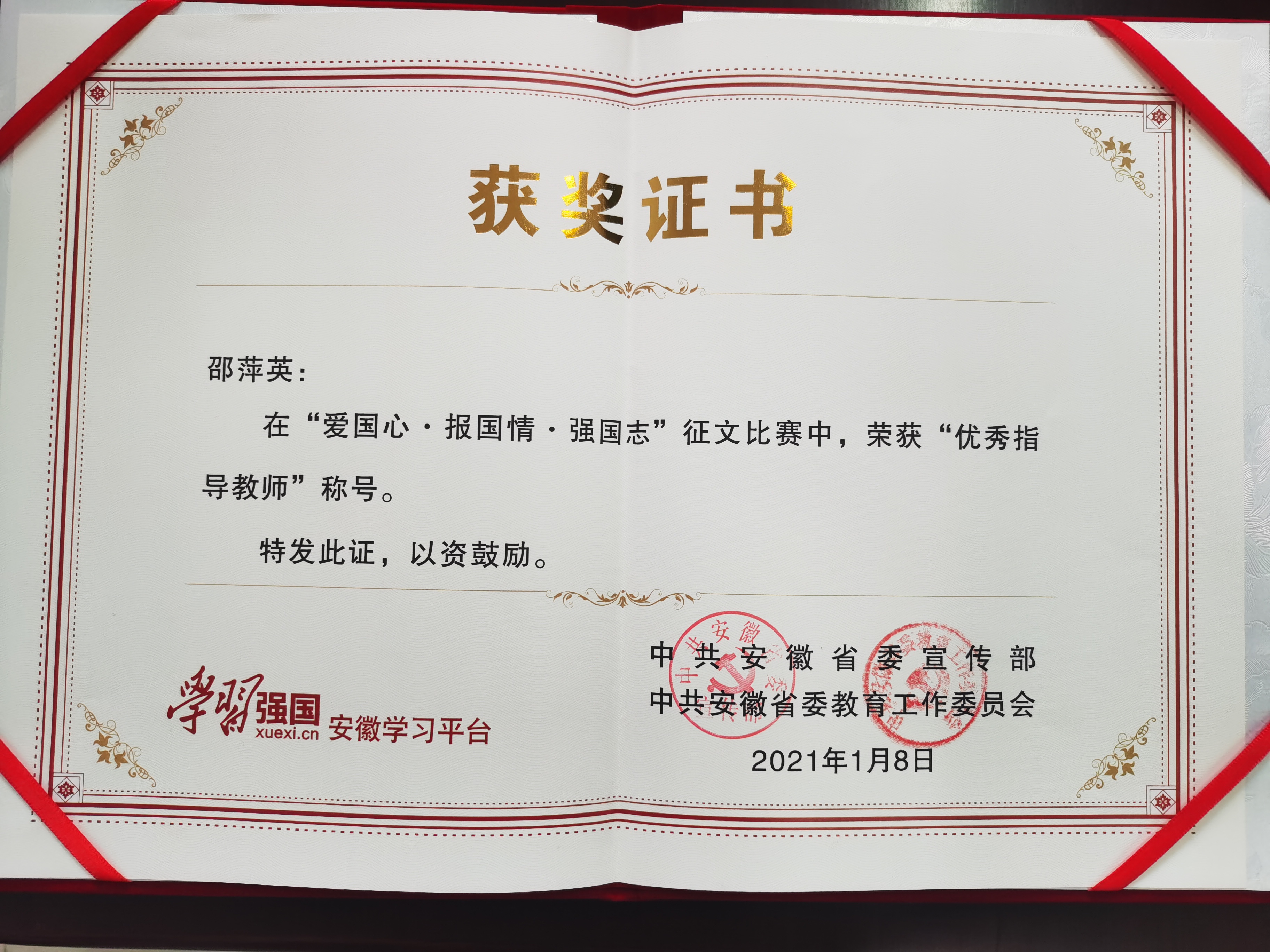 此次征文活动由安徽省委宣传部、省委教育工委以“爱国心·报国情·强国志”为主题,面向全省开展,活动自2020年8月启动后,“学习强国”安徽学习平台通过供稿链路、邮箱、海投系统三个渠道共收到稿件5637篇,最终评选出114篇获奖作品及113名优秀指导教师,其中大学组仅有14篇获奖作品。