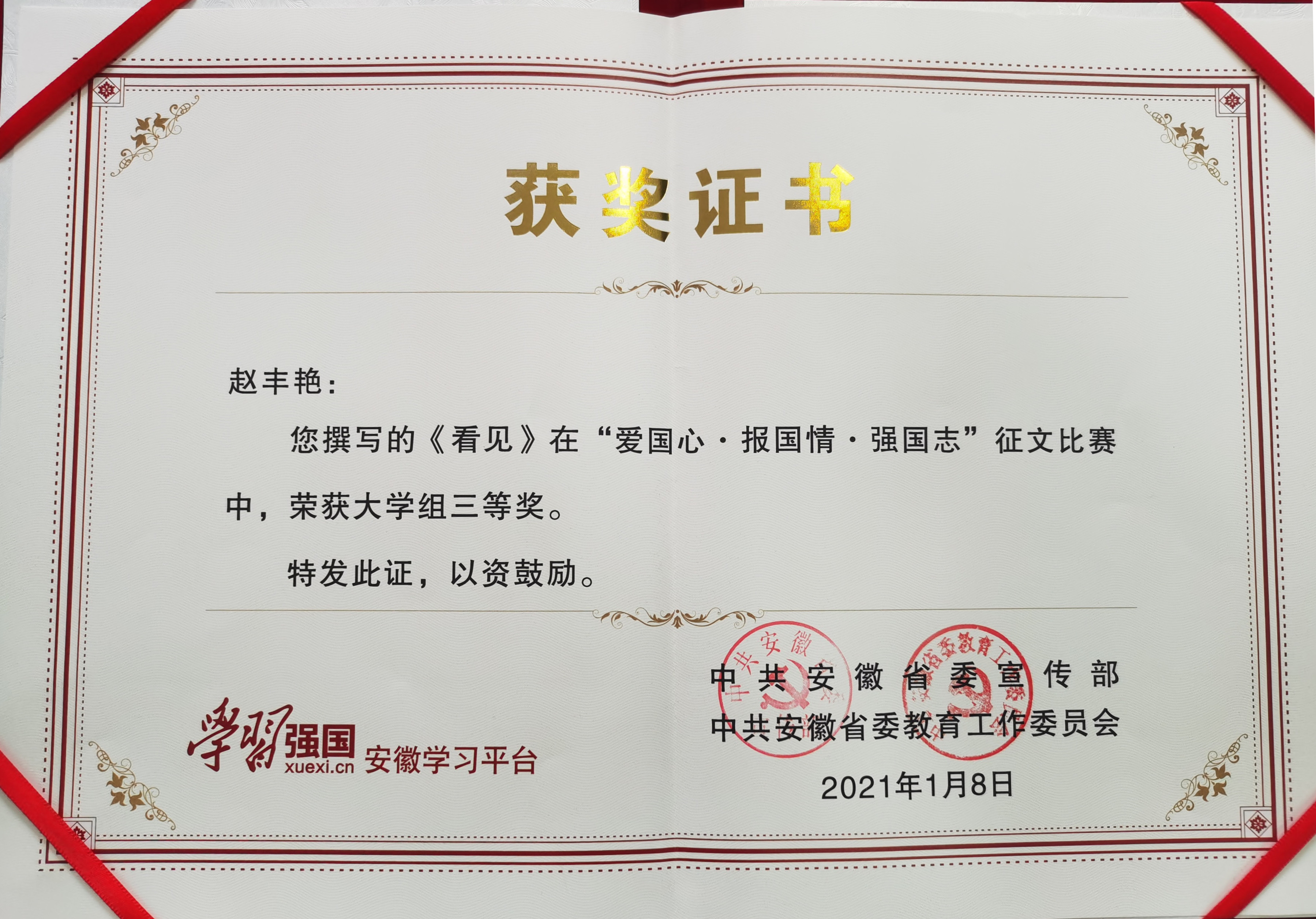 本网讯(通讯员:刘丽娟)近日,“学习强国”安徽学习平台“爱国心·报国情·强国志”征文活动获奖名单出炉,bat3652020级赵丰艳同学的作品《看见》荣获大学组三等奖,马克思主义学院邵萍英老师荣获“优秀指导教师”称号。