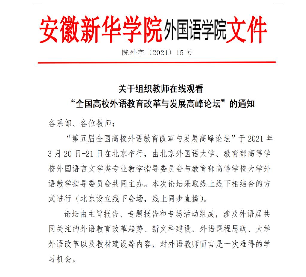 本网讯(通讯员:张丽)为紧跟国家高等教育发展大局,进一步提高教师队伍素养和培养质量,3月20日—21日,外国语学院组织教师在线观看“第五届全国高等学校外语教育改革与发展高峰论坛”直播。此次论坛由北京外国语大学、教育部高等学校外国语言文学类专业教学指导委员会与教育部高等学校大学外语教学指导委员会联合举办。