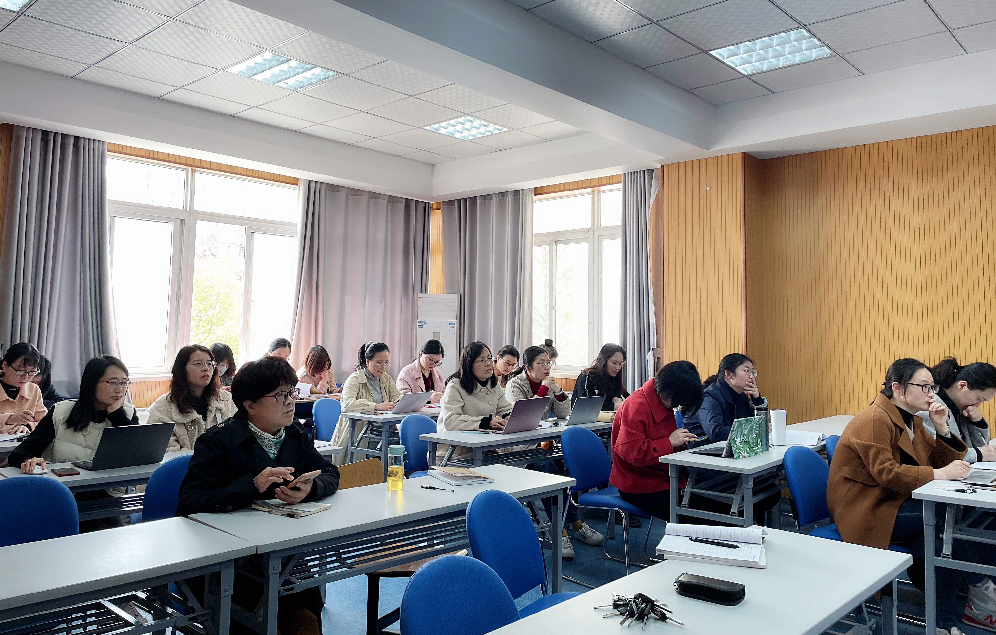 首先,张曼丽老师进行了《专业综合素质实训(1)》课程的试讲,对英语专业专四考试的考试流程、题型、分值等方面进行了全面解。通过20分钟的试讲,老师们了解了其授课思路、课程内容的安排及对于教学的思考。随后,佘月月老师和吴晓群老师分别结合实际教学经验分别在开展真题分析、技巧训练和网络资源利用等方面对新教师提出了部分建议。