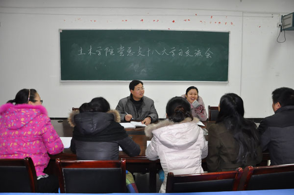 本网讯(通讯员 顾广娟)11月8日,举世瞩目的中国共产党第十八次全国代表大会在北京隆重召开。会后,土木与环境工程学院高度重视、精心部署,把传达学习、贯彻落实好党的十八大精神作为当前和今后一个时期的重要政治任务,积极组织开展多种形式的学习宣传活动。经过一个阶段的学习,12月20日,该学院党总支全体党务干部在会议室开展了十八大学习交流。