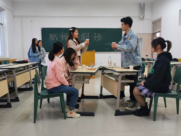 活动以小组形式展开,各小组设计职场场景并演绎,既有职场常见的面试、实习、人际交往和员工管理等主题场景,也有加班、酒桌文化等职场热点话题。活动现场,学生将职场技能融入表演,每组结束后学生代表进行翻转课堂,向大家讲解和总结职场知识。其中表现突出的是面试组和酒桌文化组,他们以精心的情节设计、精彩的演出赢得了大家的掌声与肯定,同时也传递了面试现场礼仪和酒桌礼仪。
