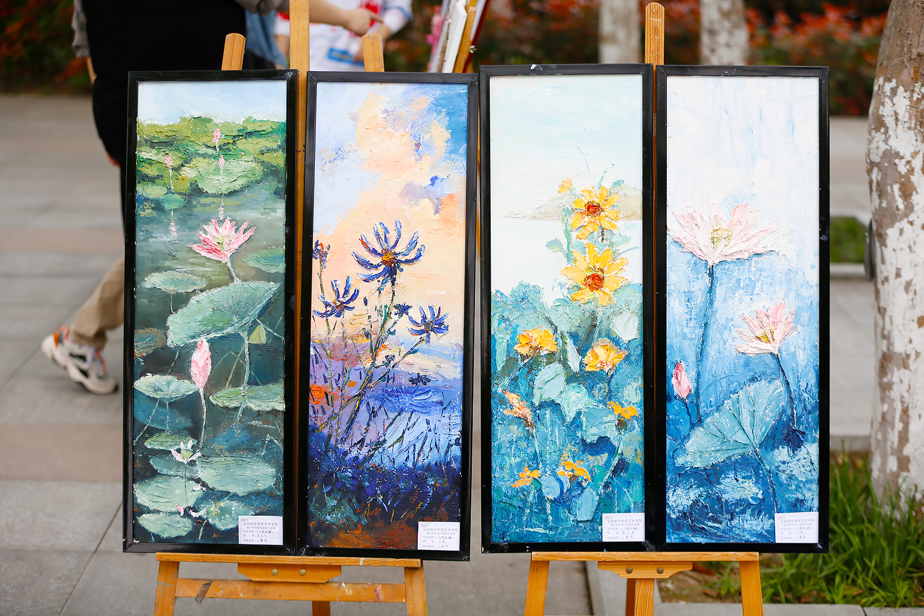 其中有一幅名叫《鲤对》的作品是由6名学生各自创作6幅画作拼接而成,“很喜爱鲤鱼,从灵感构思到最终完成画作仅花费了一周时间。”画作作者,2018级艺术学院环境设计3班的学生王琪琛说道,“这次不同于以往的课堂,在老师的帮助下,我们寝室6个人通力协作,共同完成创作及展出全过程。不仅积累了学习和实践经验,更给了我们很大的信心,期待未来有更多机会参展。”
