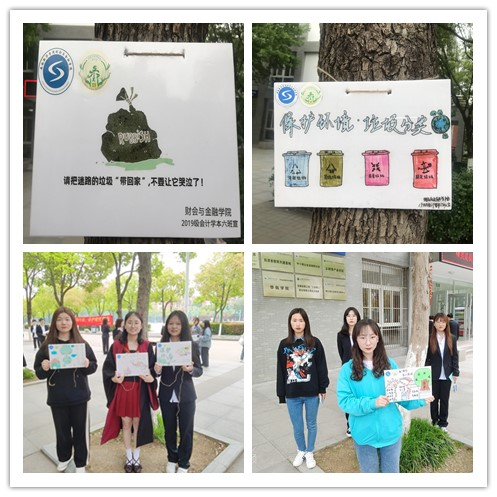 全班同学结合“四化”校园主题,开展绿色环保文创活动,并用作品给财金学院门口树木“穿新衣”——悬挂保护环境宣传板,让环保理念、绿色财金、美丽校园根植于学生心中。