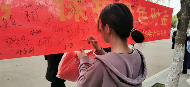 此外,班级同学面向全校发放了“美丽财金”的宣传单,用响亮的口号吸引来往的老师同学在“保护环境,从你我做起”的横幅上签字,并佩戴上此次活动的纪念胸章。