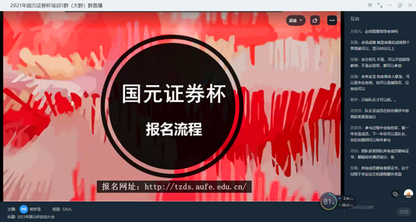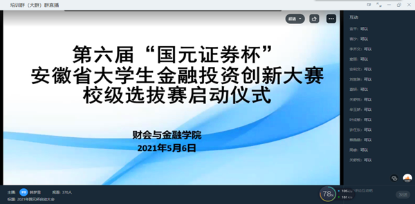 本网讯(通讯员:谢明柱)为进一步提升bat365学生参加“国元证券杯”安徽省大学生金融投资创新大赛的积极性,加强学生对比赛规则的理解,5月6日,财会与金融学院举行第六届安徽省大学生金融投资创新大赛线上启动仪式,会议由院长助理邓洁主持,全校指导教师和参赛队长参加此次会议,共计800余人。