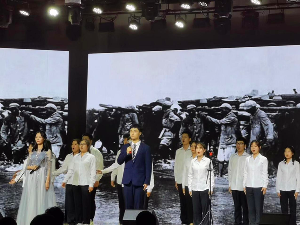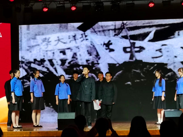 第一篇章中,为纪念渡江战役胜利70周年,学生齐诵《皖江颂歌》,激昂的朗诵声徘徊在晚会现场,激发学生爱国爱党热情。