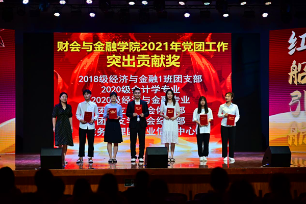 晚会中,财会与金融学院还对2020-2021学年中积极参加党团活动、学科竞赛的个人和集体进行表彰,希望全体财金学子以先进为榜样,不断提升思维品质、探索精神和创造才能,努力增强全体党员责任意识与爱国情怀。