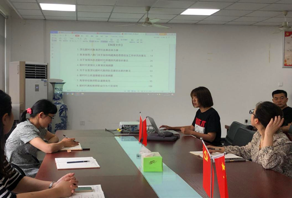 在专题学习会上,首先,张璐结合《教育部等八部门关于加快构建高校思想政治工作体系的意见》《新时代高校教师职业行为十项准则》以及《高等学校教师职业道德规范》,通过黄大年、李保国、钟扬等先进事迹案例,对全体教师从爱岗敬业、为人师表、关爱学生等方面提出具体要求。随后,教师支部副书记贾婷婷带领大家学习《教育部关于高校教师师德失范行为处理的指导意见》《教育部关于加强学术道德建设的若干意见》《关于进一步加强科研诚信建设的若干意见》等内容。最后,濮明月作总结讲话,她鼓励全体教师要努力提升自身道德素质、用榜样的力量和人格魅力感染学生,把对学生的思想道德教育融入至日常的教育教学工作中,努力践行新时期“立德树人,求知成长”的教育核心价值观。