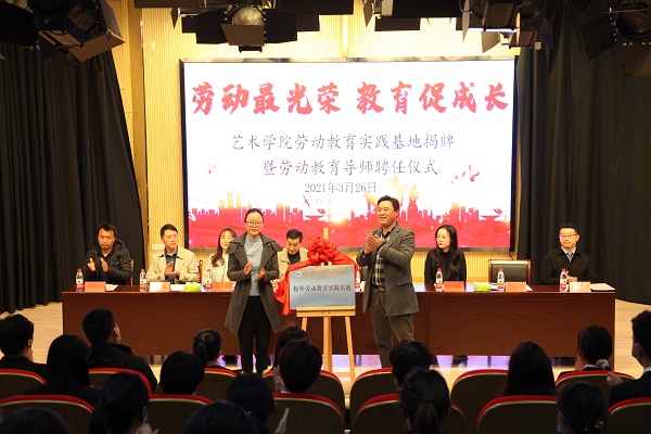 3月26日,艺术学院在文传演播厅举办劳动教育实践基地揭牌暨劳动教育导师聘任仪式。校劳动教育研究中心主任朱平、校学生处处长助理计羚、艺术学院劳动教育导师、艺术学院领导班子及全体学工人员和学生代表参加了本次仪式,仪式由艺术学院院长助理彭智主持。