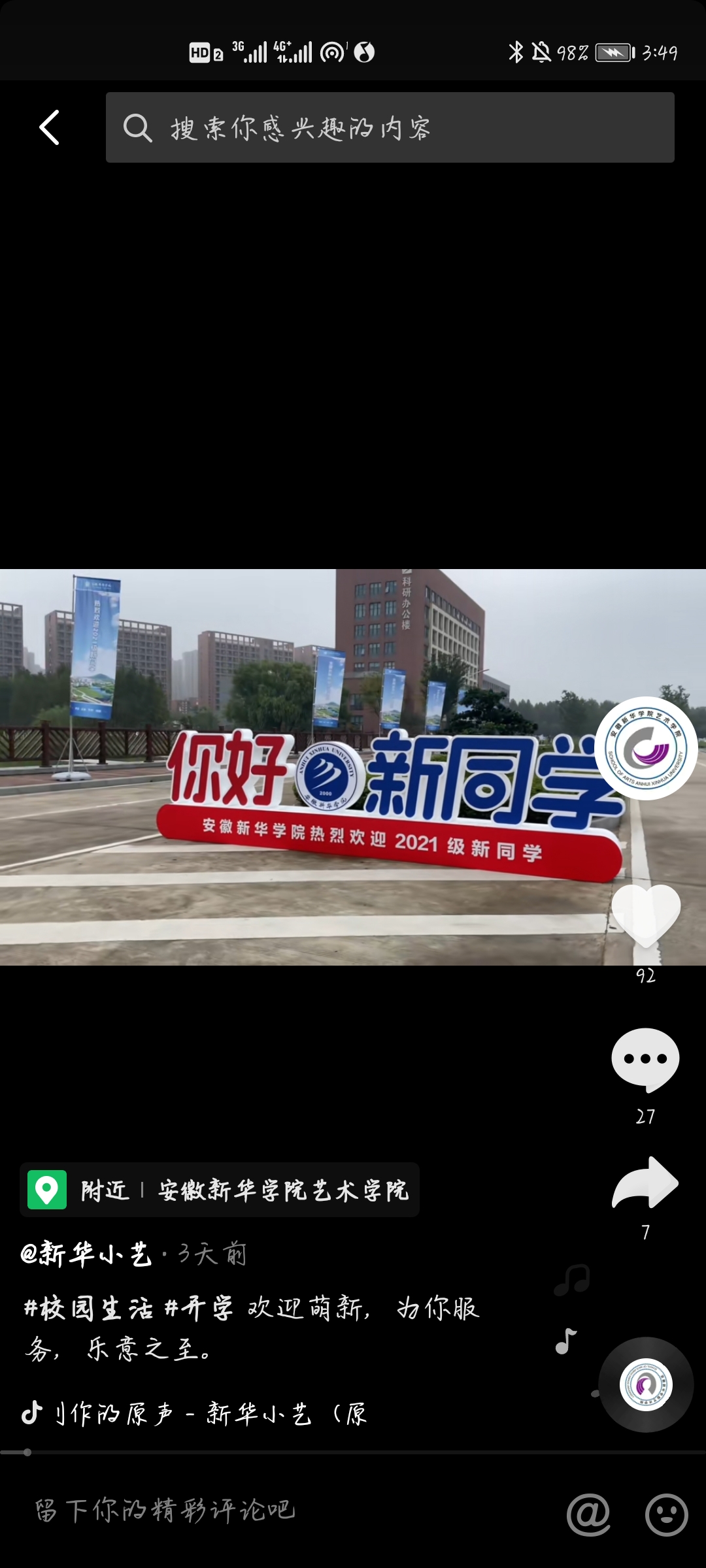 在艺术学院新生报到前,学院前置通过“新华艺院”官微进行新生专业介绍,同时通过抖音传播学校资讯,内容涉及学习指南、生活指南、专业思想等,使学生提前了解学院,熟悉校园的生活环境,做好角色转换,顺利开启大学生活。
