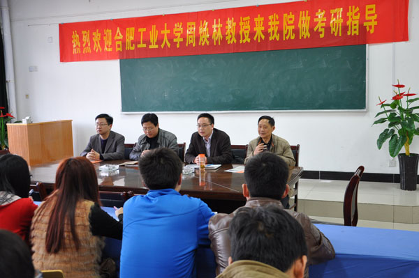 7日下午,周焕林教授作了专题报告,他就合肥工业大学的2013年的考研生招生计划及招考专业做了深入细致地分析,以合肥工业大学研究生招考为例,分析了其他大学的招考形式,同时,给了同学们很多宝贵的建议。报告后半部分,同学们积极提问,有的同学问到英语口试的技巧问题,有的同学关心调剂的程序,有的同学想了解如何知道排名情况,周焕林一一作了细致的回答。最后,周焕林还就考研报考的技巧问题做了详细的讲解,希望对考研成绩不佳,还有考研打算的同学提供参考。