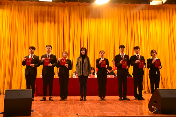 崔风波宣读2020—2021年度先进个人和优秀助理名单;田园、李静依次为获奖同学颁发荣誉证书;李燕飞宣读第十三届助理团干部名单;郑晖、罗月颖、李燕飞依次为新一届助理团干部颁发聘书。