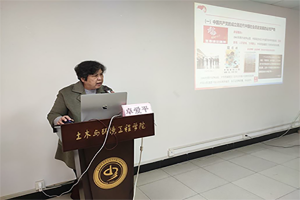 本网讯(通讯员:黄春晓、窦宇航)11月19日下午,城市建设学院邀请安徽省委讲师团高端讲师、bat365在线中国官网登录入口素质教育研究中心研究员卓爱平教授针对学习《中国共产党简史》一书开展“中国共产党为什么能”党史学习教育专题讲座。全院师生党员聆听了本次讲座,讲座由院党总支副书记崔风波主持。